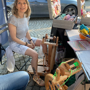 Bild 6 Projekt; Inner Circle von Drops Design mit handgesponnener Wolle, die Menge ist mal fertig gesponnen und muss noch ins Entspannungsbad. Der Pulli wird wohl gegen Herbst angstrickt.... Bild 7 Projekt; weils so schön zu stricken ist!! "Catch the Wind" zum Dritten. Dieses Mal möchte ich das Shirt gerne mit handgsponnenem viscosiertem "Black Diamond Bambus" Garn stricken. Ich frage mich noch ob ich Highlights mit SariSeide setzen soll oder doch eher schlicht verspinnen/verzwirnen soll???